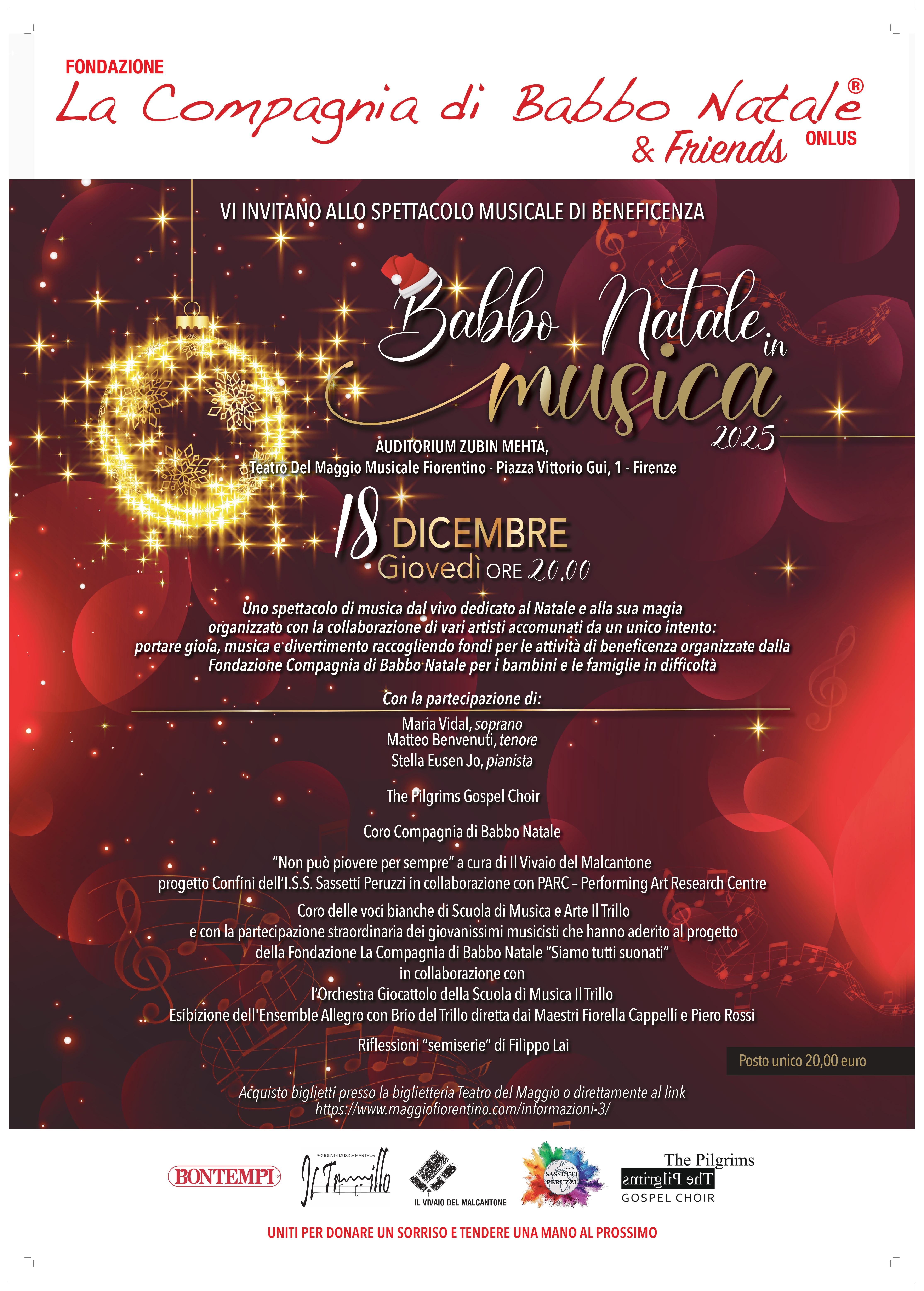 Uno spettacolo di musica dal vivo dedicato al Natale e alla sua magia organizzato con la collaborazione di vari artisti accomunati da un unico intento: portare gioia, musica e divertimento raccogliendo fondi per le attività di beneficenza organizzate dalla Fondazione Compagnia di Babbo Natale per i bambini e le famiglie in difficoltà.