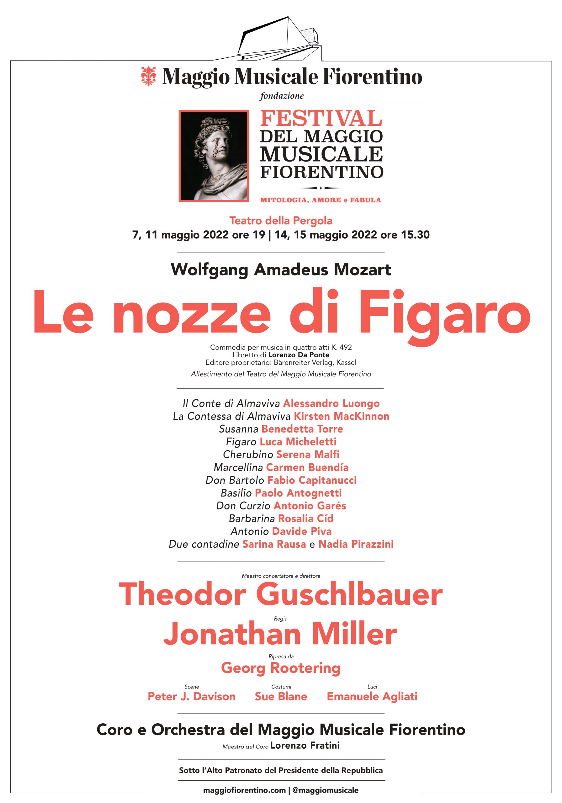 Rendiamo noto che il maestro Marc Minkowski non dirigerà più l’opera "Le nozze di Figaro" e, al suo posto, salirà sul podio il maestro Theodor Guschlbauer. A seguito di ciò l’ultima recita, prevista per il 19 maggio 2022 ore 19 al Teatro della Pergola, è spostata all’11 maggio 2022 (stesso orario e stesso luogo).